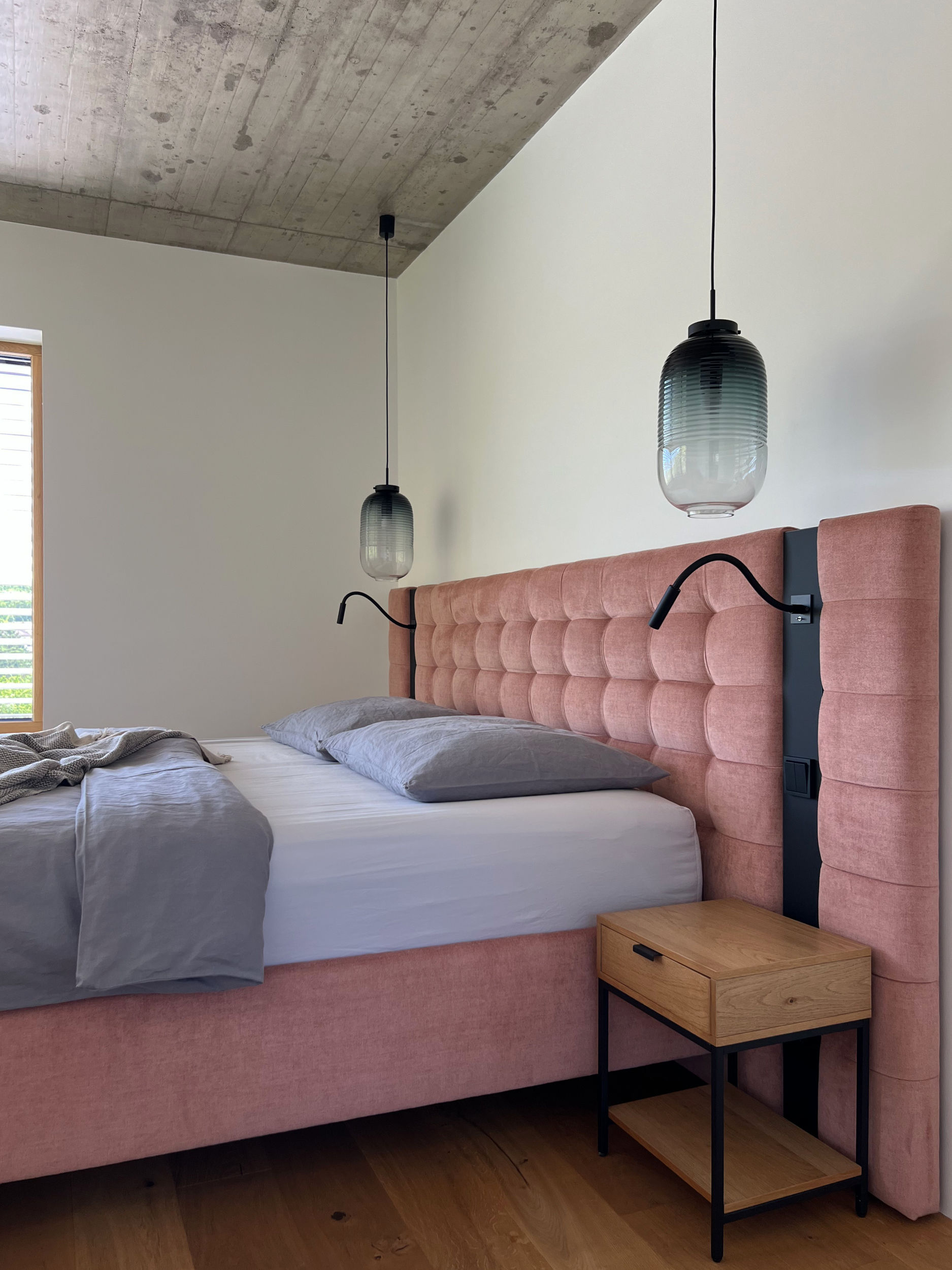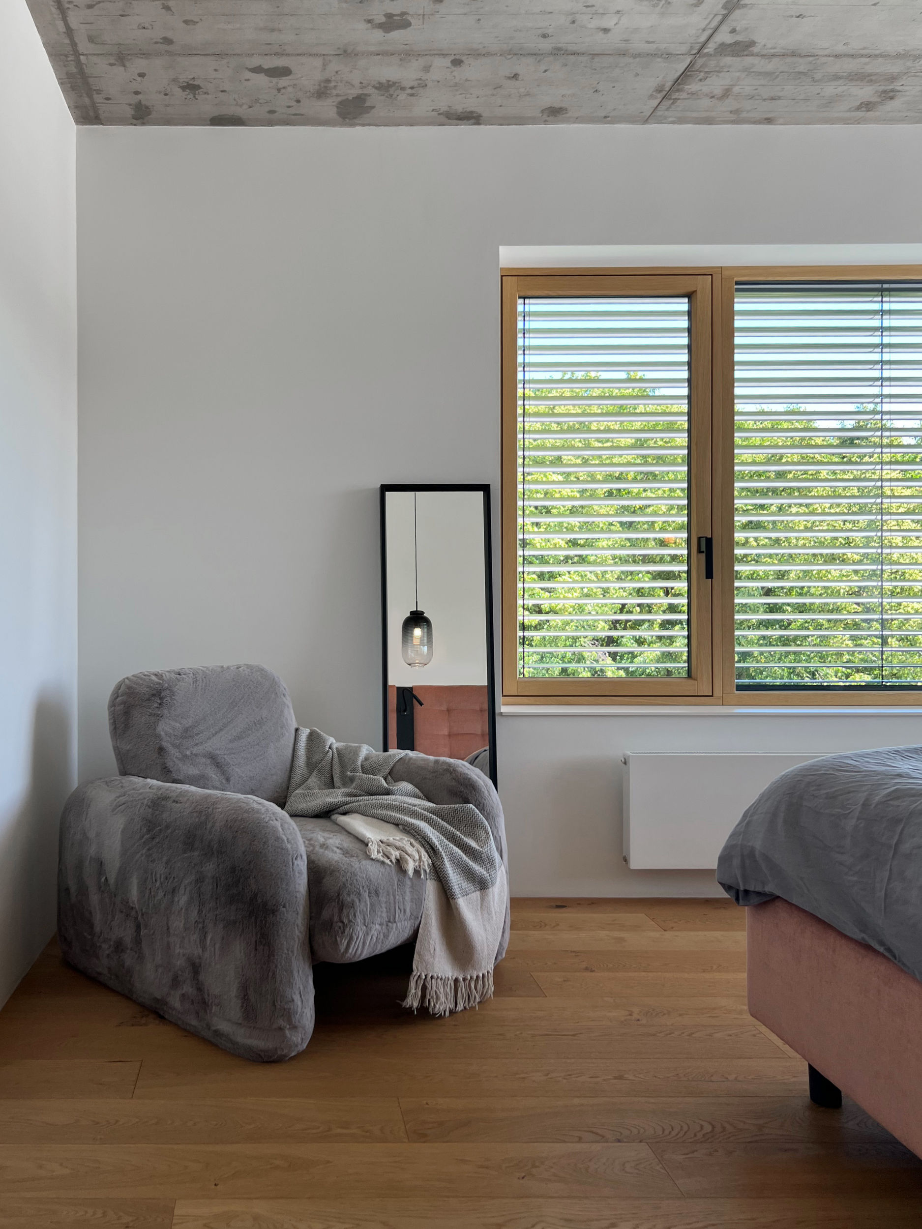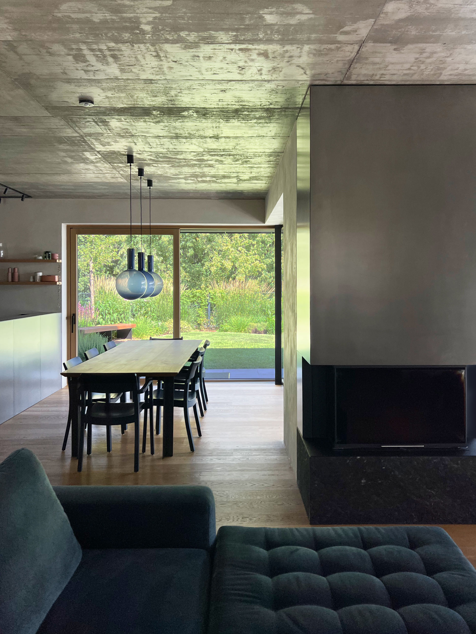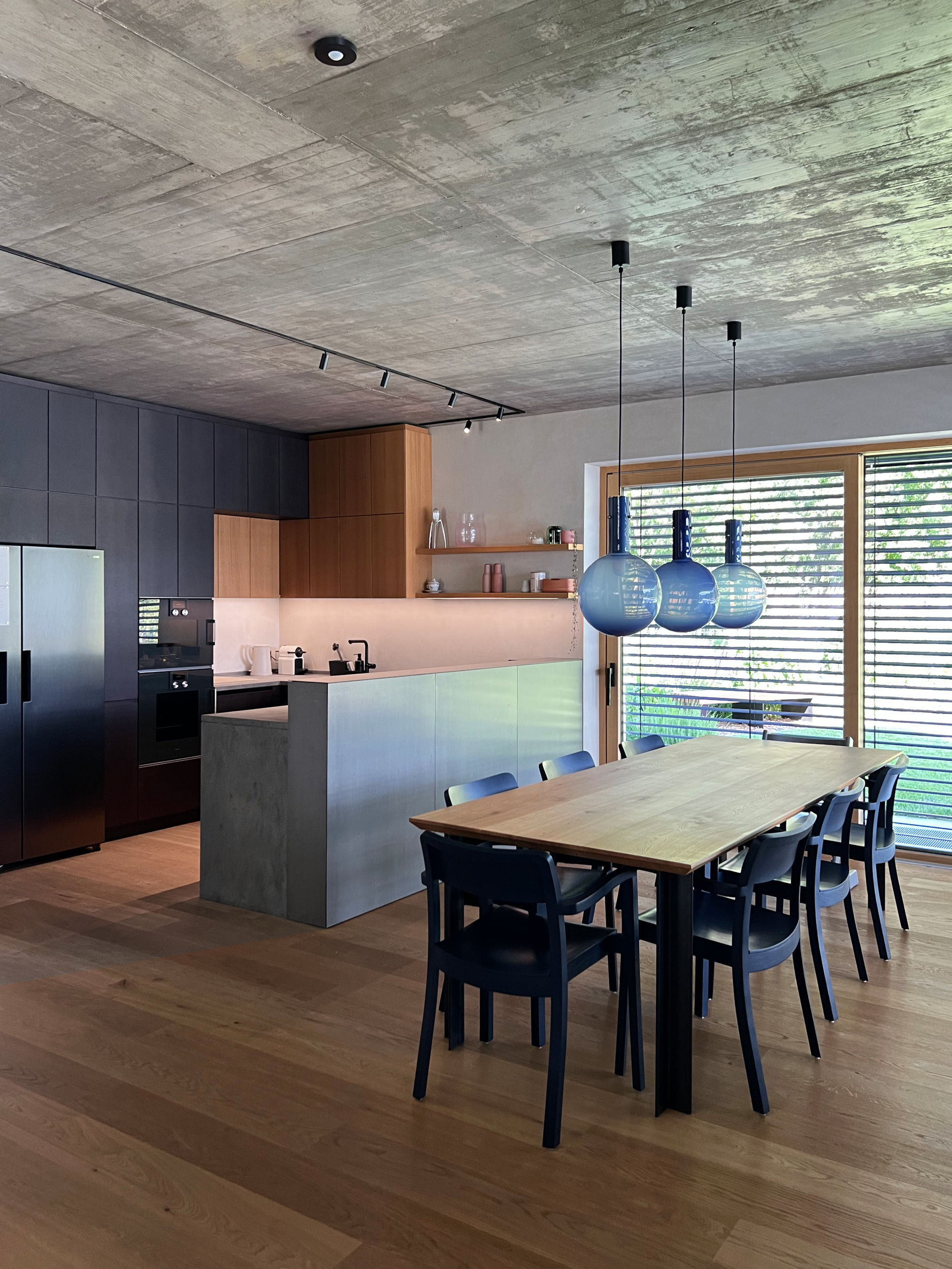 Dům má velké prosklené plochy osazené okenními výplněmi od Josko v kombinaci dřevo - hliník. K okenním rámům jsme ladili podlahu i truhlářské prvky v dubové dýze. Teplé tóny dřeva jsou vyváženy betonovým stropem, který se pouze zafixoval proti prašnosti a nechal ve své přirozenosti.