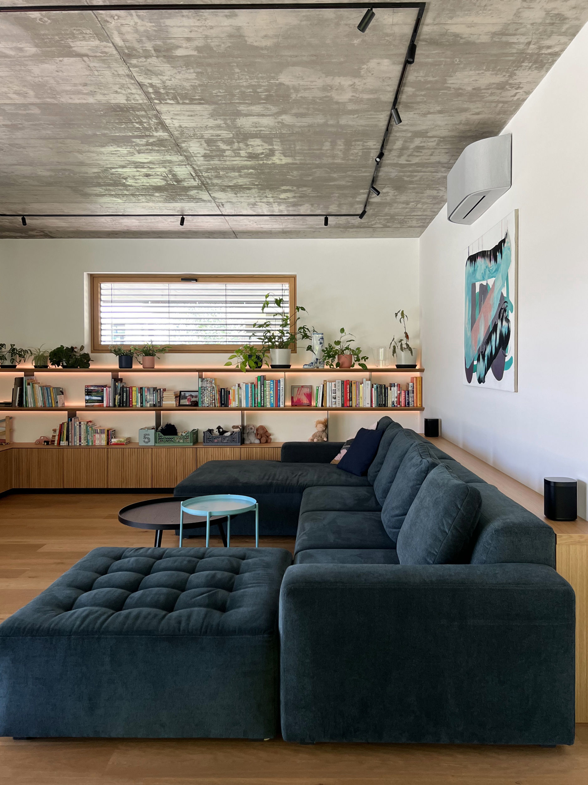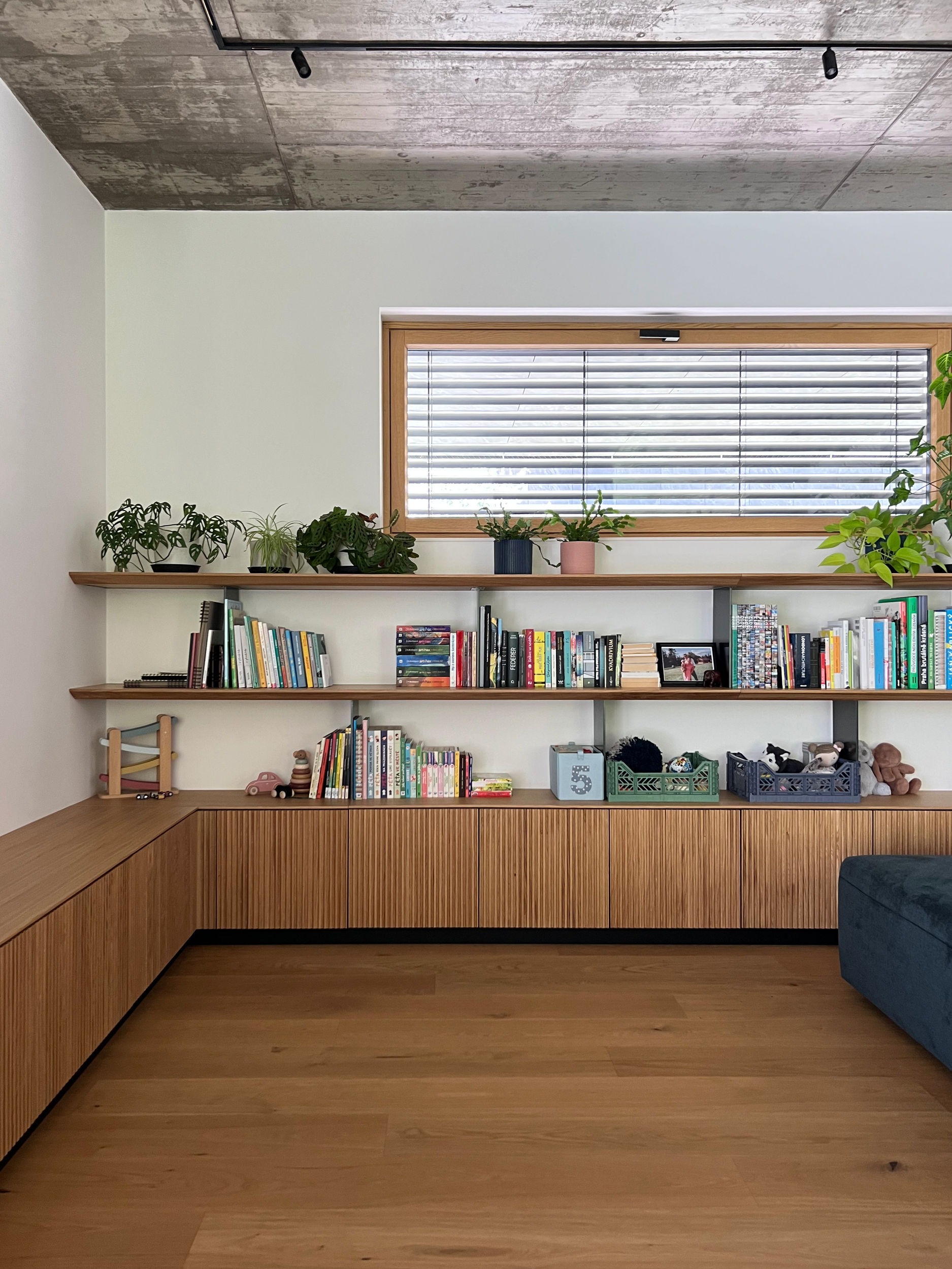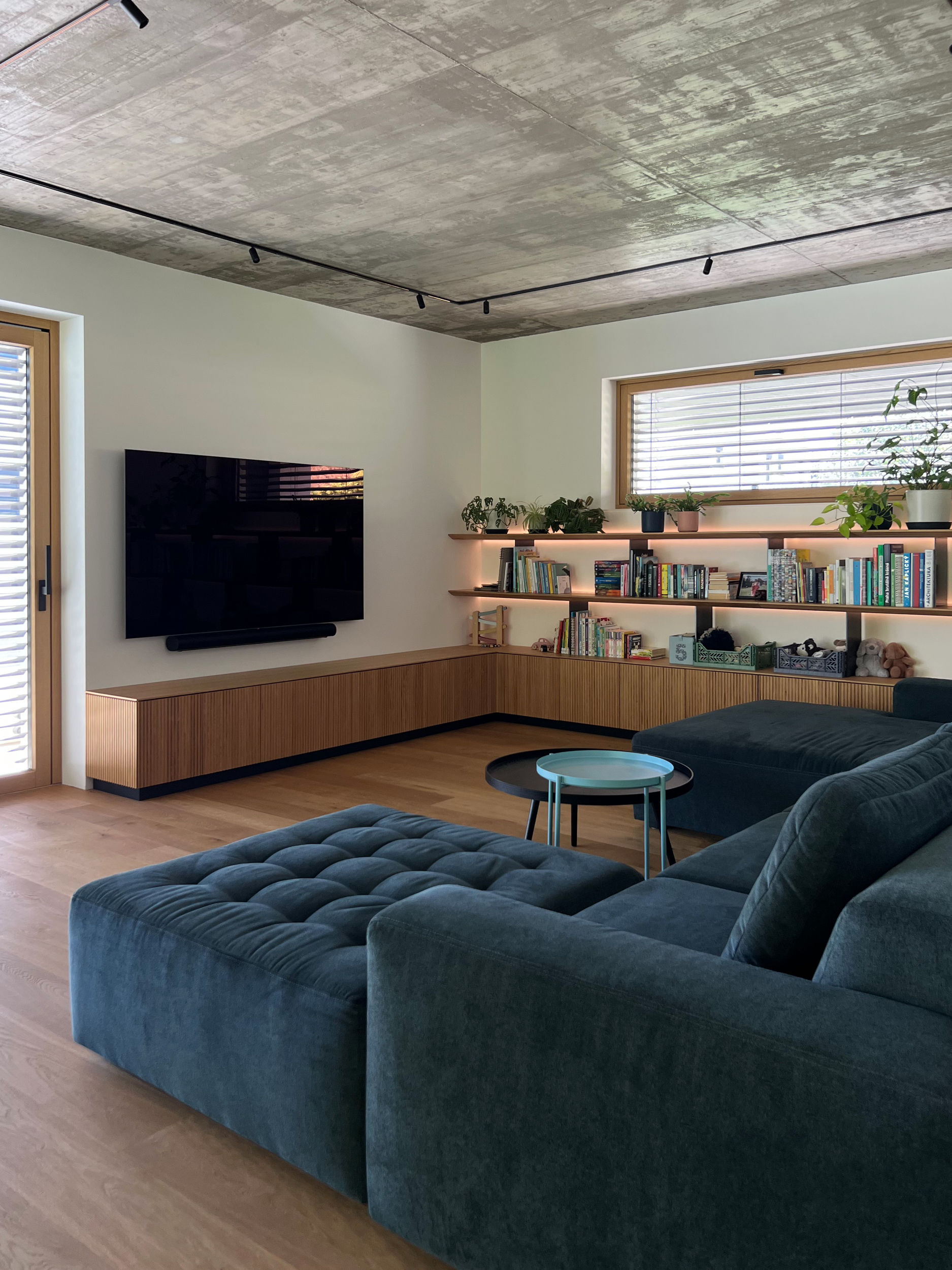 Abychom docílili variability prostoru, použili jsme k osvětlení track lišty s reflektory. Neutrální systémové osvětlení je na exponovaných místech doplněno světly od Dechem a Bomma. Modrý akcent se propisuje u jídelního stolu, v obývacím prostoru se sofa od Polstrin, v obraze od Patrika Kriššáka nebo ve vstupní šatně s lamelami v modrém laku.