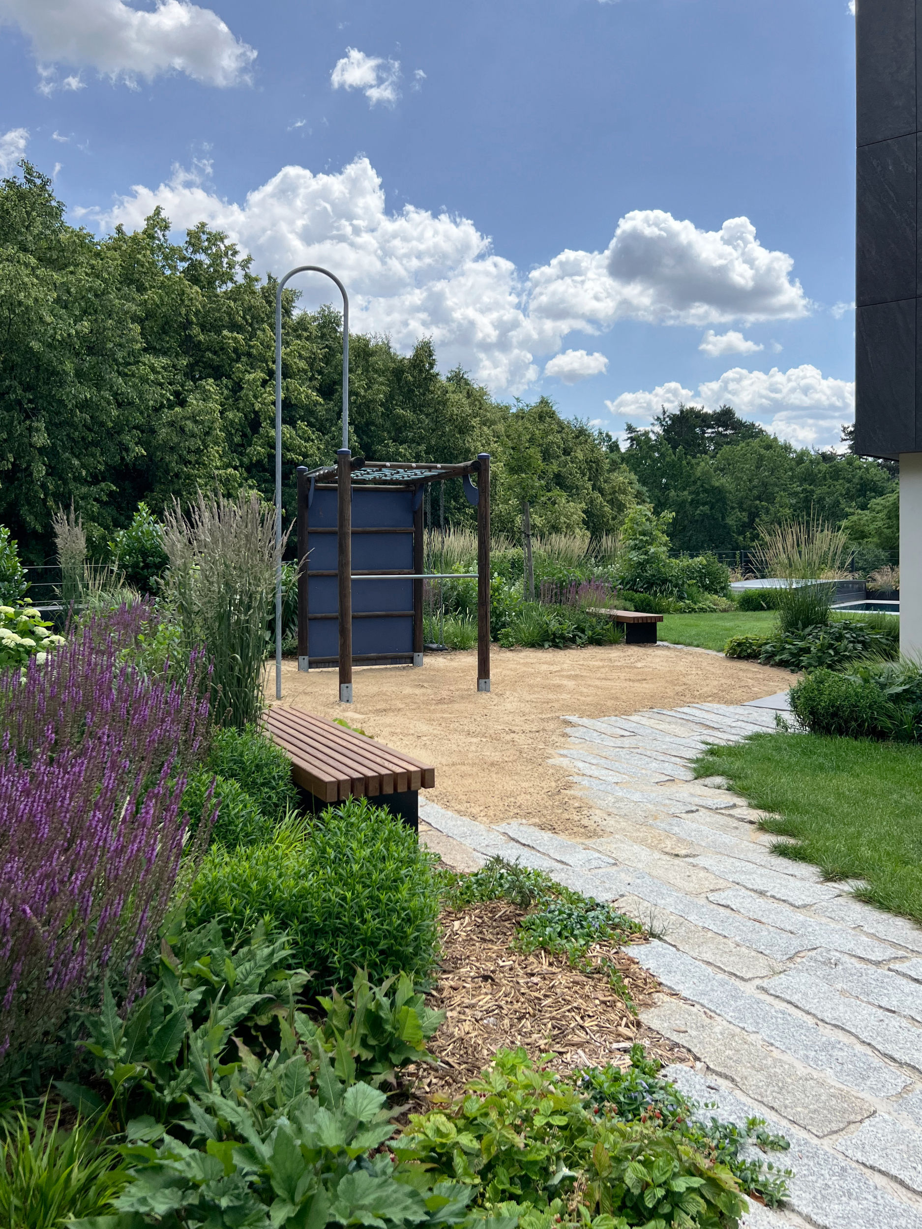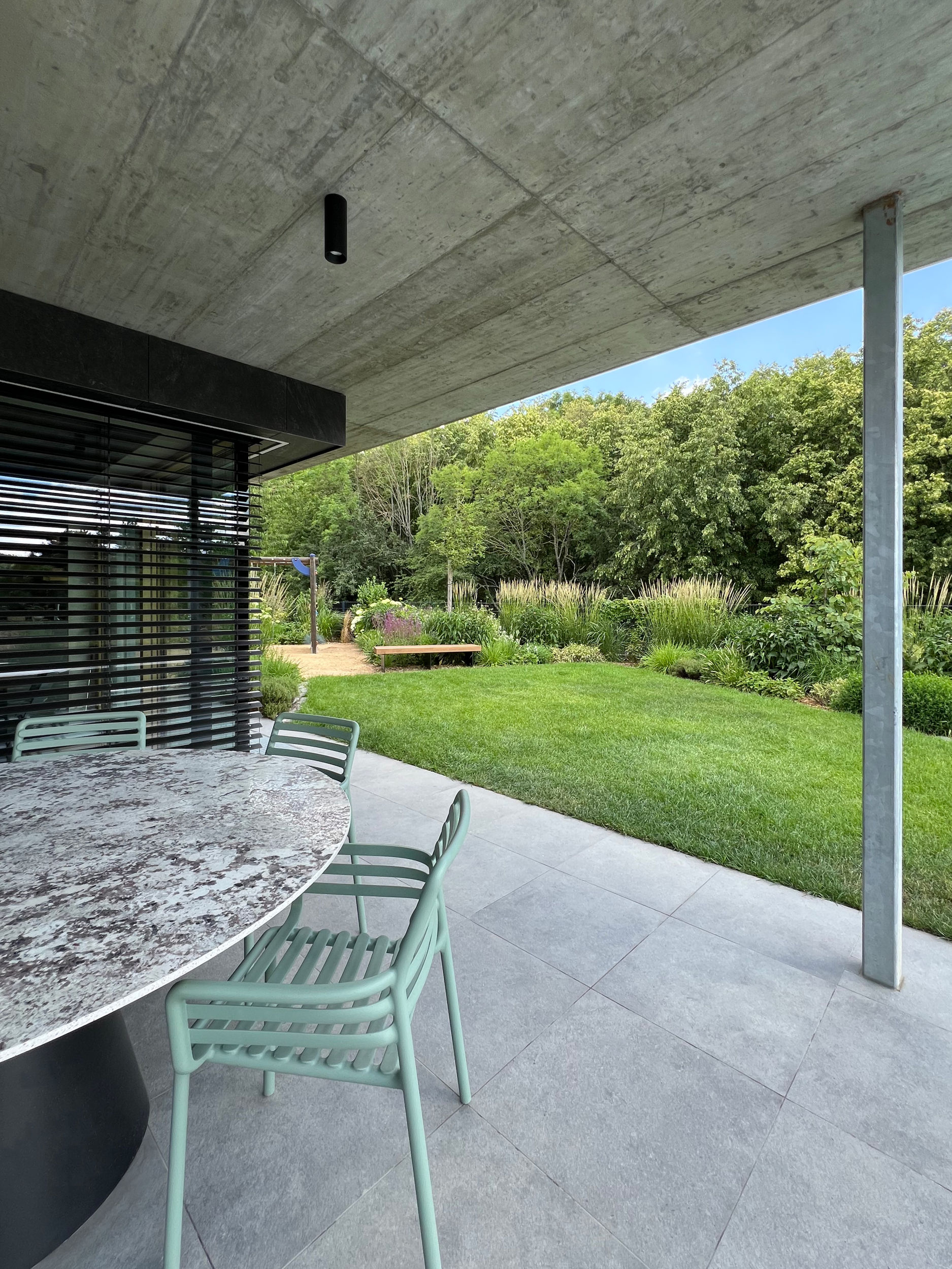 Obytný prostor je v přímém kontaktu se zahradou navrženou ateliérem Partero. Ti svým dokonalým návrhem dokázali i v exteriéru vytvořit „pokojíčky“ s několika atmosférami. Díky prostorovému uspořádání i správně zvoleným rostlinám je zahrada už nyní propojená a působí harmonicky.
