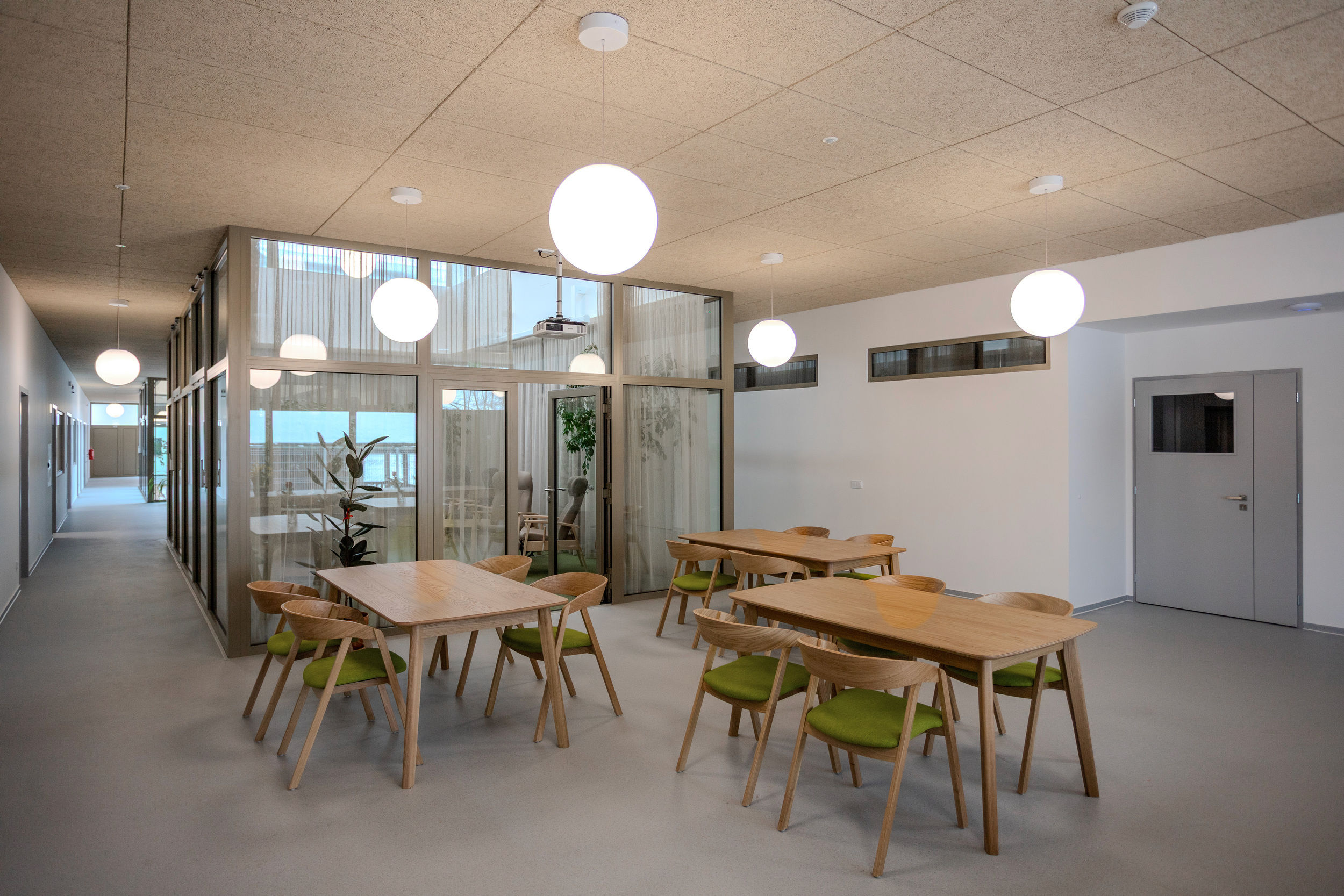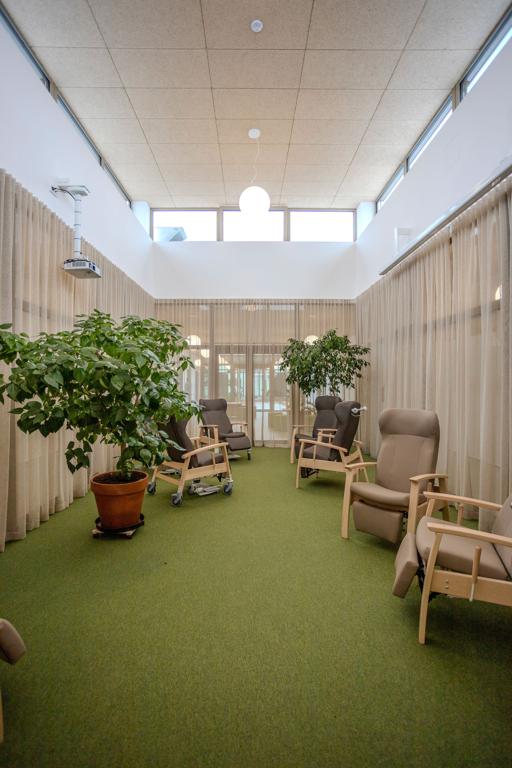 V provozní části, navázané na vstup, je veškeré zázemí pro personál, sesterny, sklady i gastro provoz. Centrální část soustřeďuje společenské dění pro klienty. Prostor je prosvětlen atriem a zastřešeným převýšeným respiriem s okny nad úrovní okolní střechy.