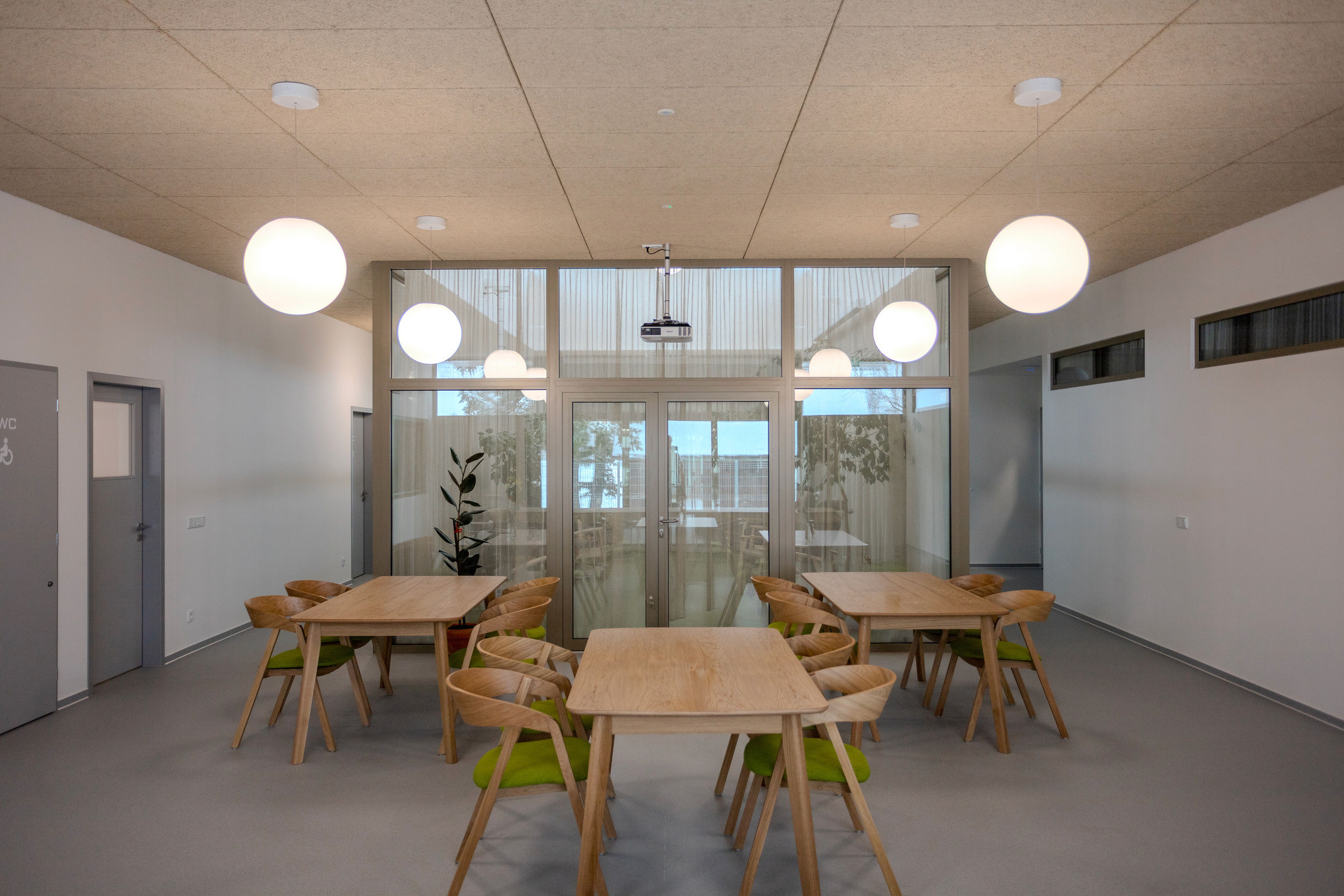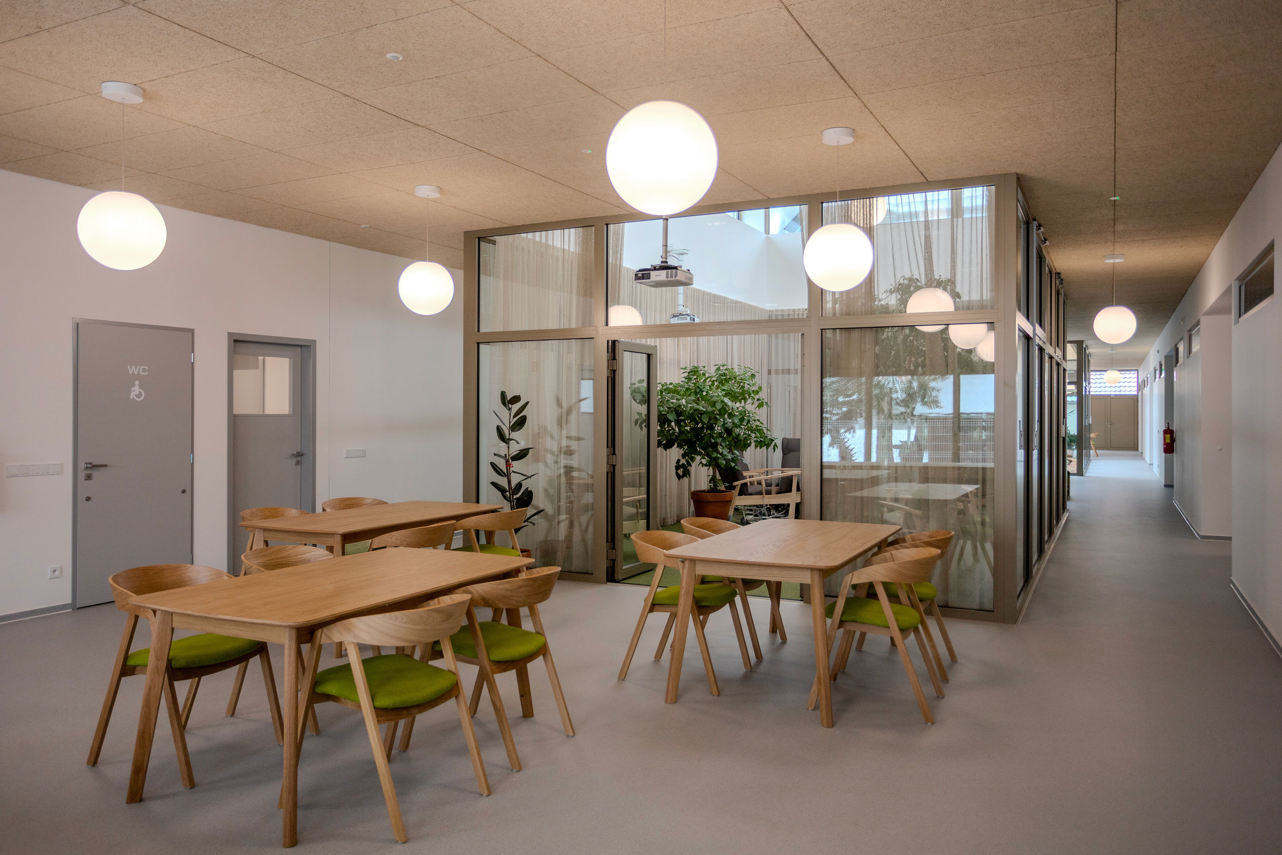 Obdélníkový tvar centra je v interiéru dělen na tři lineární zóny - provozní, společenskou a privátní.
